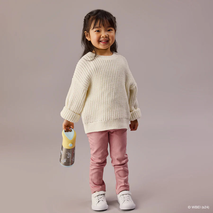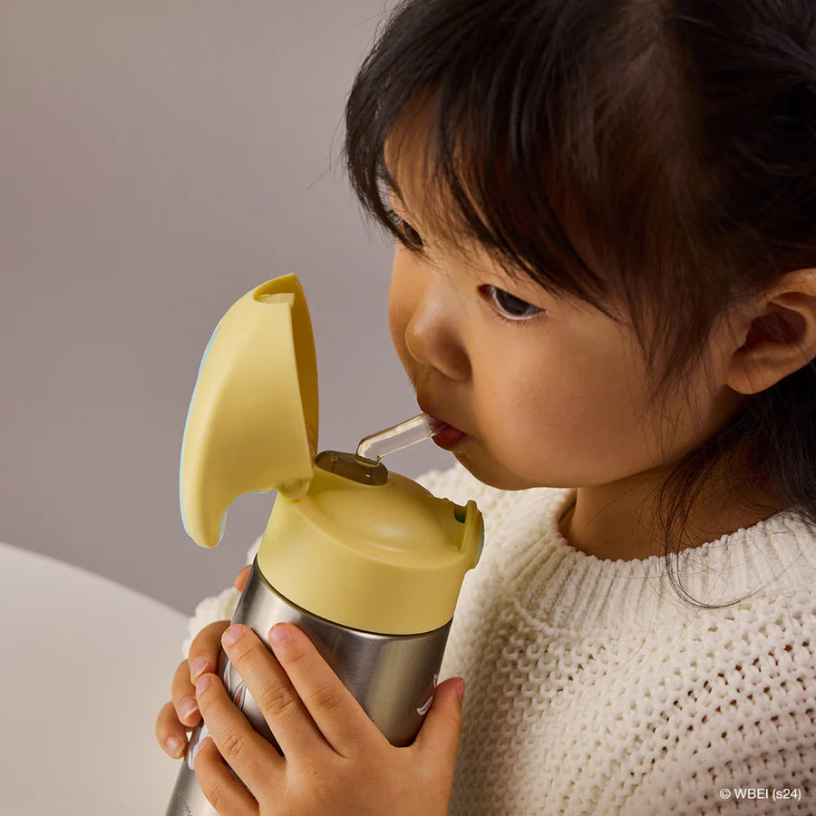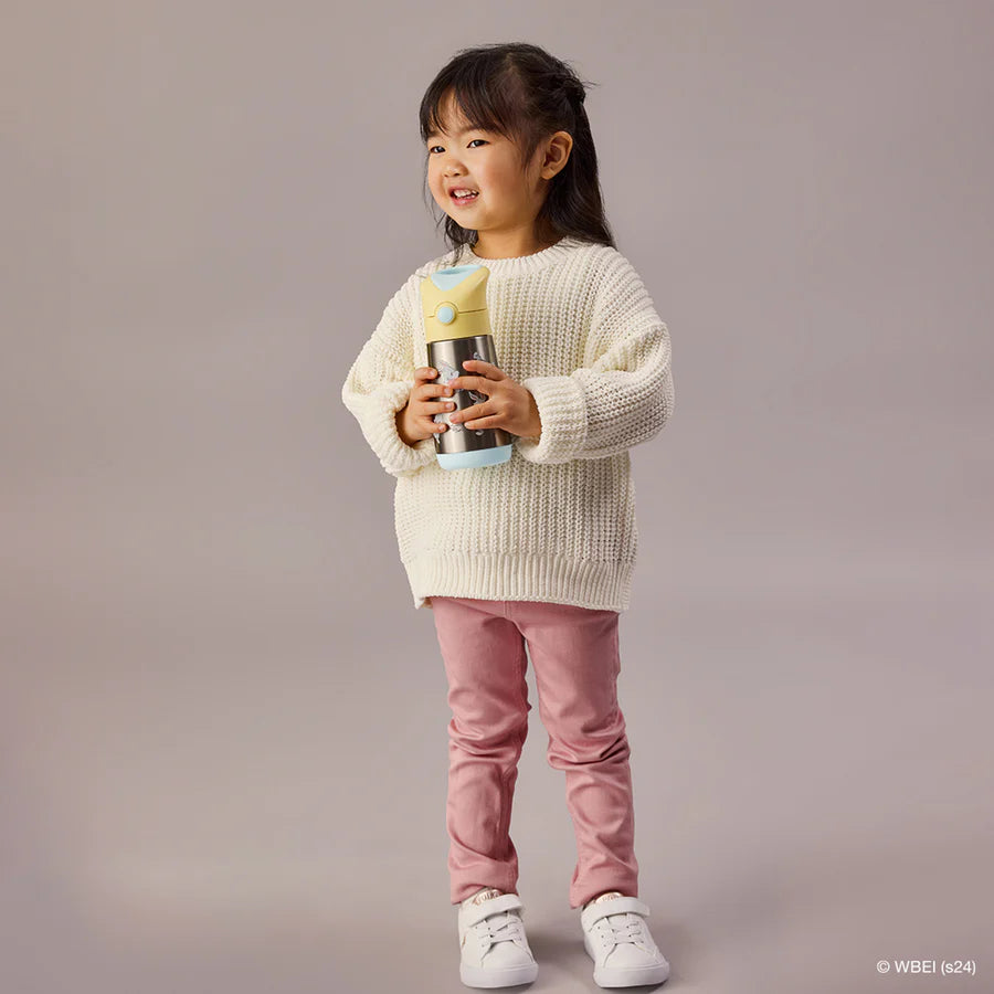 We've redefined cool with our 350ml insulated drink bottle - insulating superpowers indeed! The triple layer insulation keeps liquids cool for up to 8 hours and warm for up to 6, so now your little one can stay hydrated whatever the weather. Complete with carry handle and push button opening, designed specifically for little hands. Kids love our easy drinking silicone straw top. Parents love no leaks in the bag (when the lid is closed). If using to keep liquids warm - for best performance, fill the stainless steel base with hot water for a few minutes to warm it, before pouring water out and filling with warm liquids.