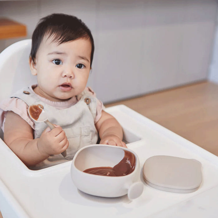 Put a lid on it! The journey to independent eating starts with silicone bowl + lid. Ergonomically designed to take little ones from parent-led feeding to independent eats.