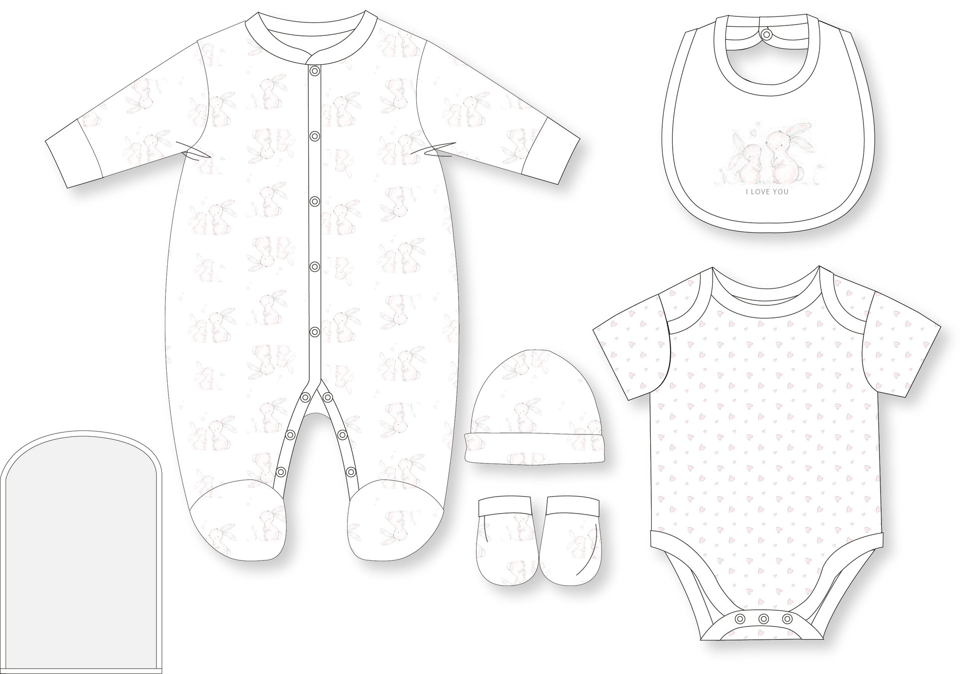 Set includes: Sleeper, Bodysuit, Hat, Mitts, and Bib