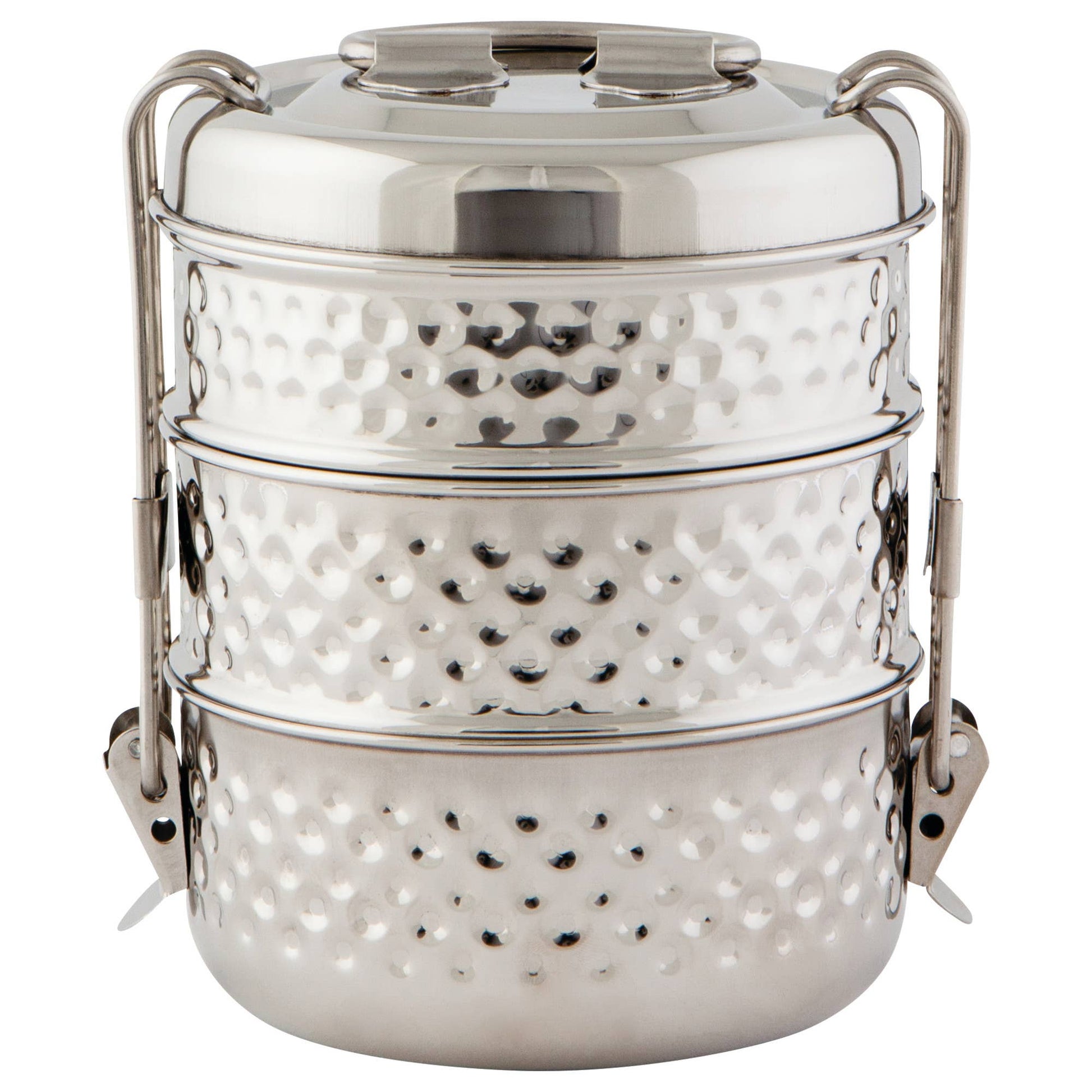 Originally used to pack up a homemade meal for transport through the busy streets of InDia , the tiffin is made up of stainless steel containers that stack together. A snap closure keeps contents secure while a handle makes carrying convenient.