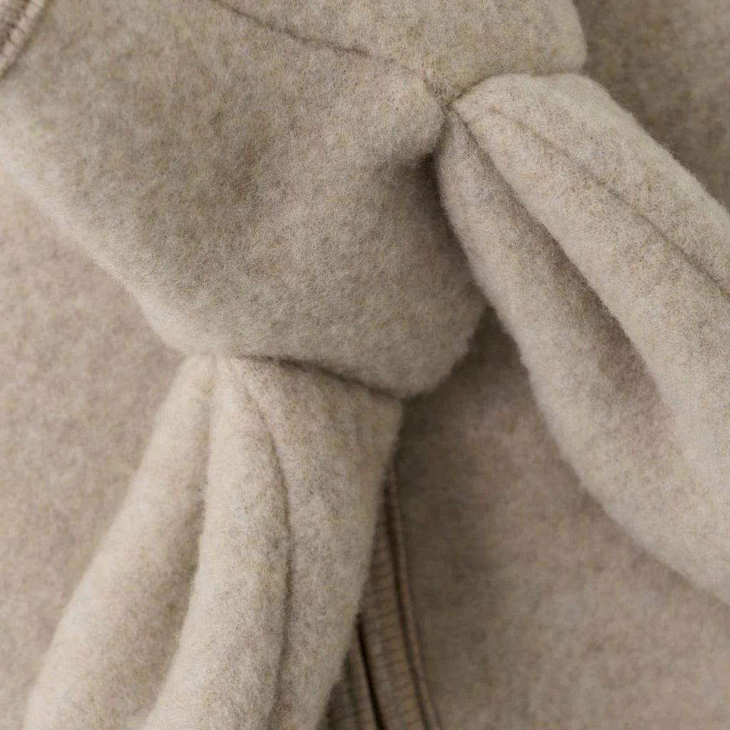 Smart, warm HUTTEliHUT all-in-one suit made of wool fleece. The HUTTEliHUT suit has a fixed hood with a rounded shape and cute little bunny ears on top. The pramsuit has long sleeves and legs with practical folds up to size 80, to keep little feet and hands warm. All openings have ribbed edges. The suit opens at the front with a hidden zipper and chin guard.