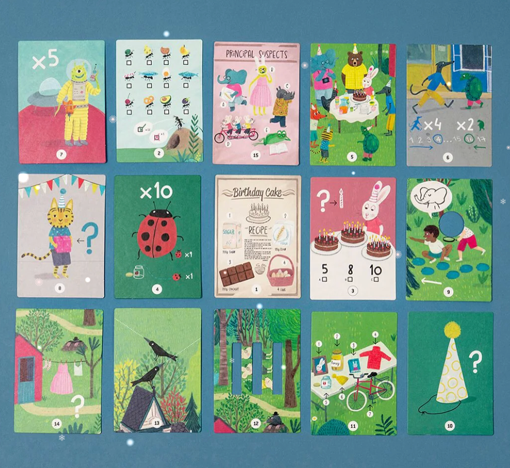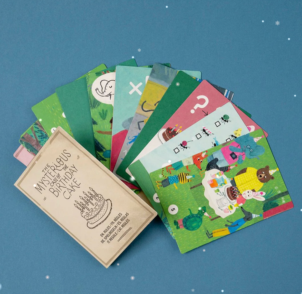 A 100-piece puzzle with a detective game. Includes 15 deduction cards to solve the birthday cake mystery. An original puzzle with a clue game.
